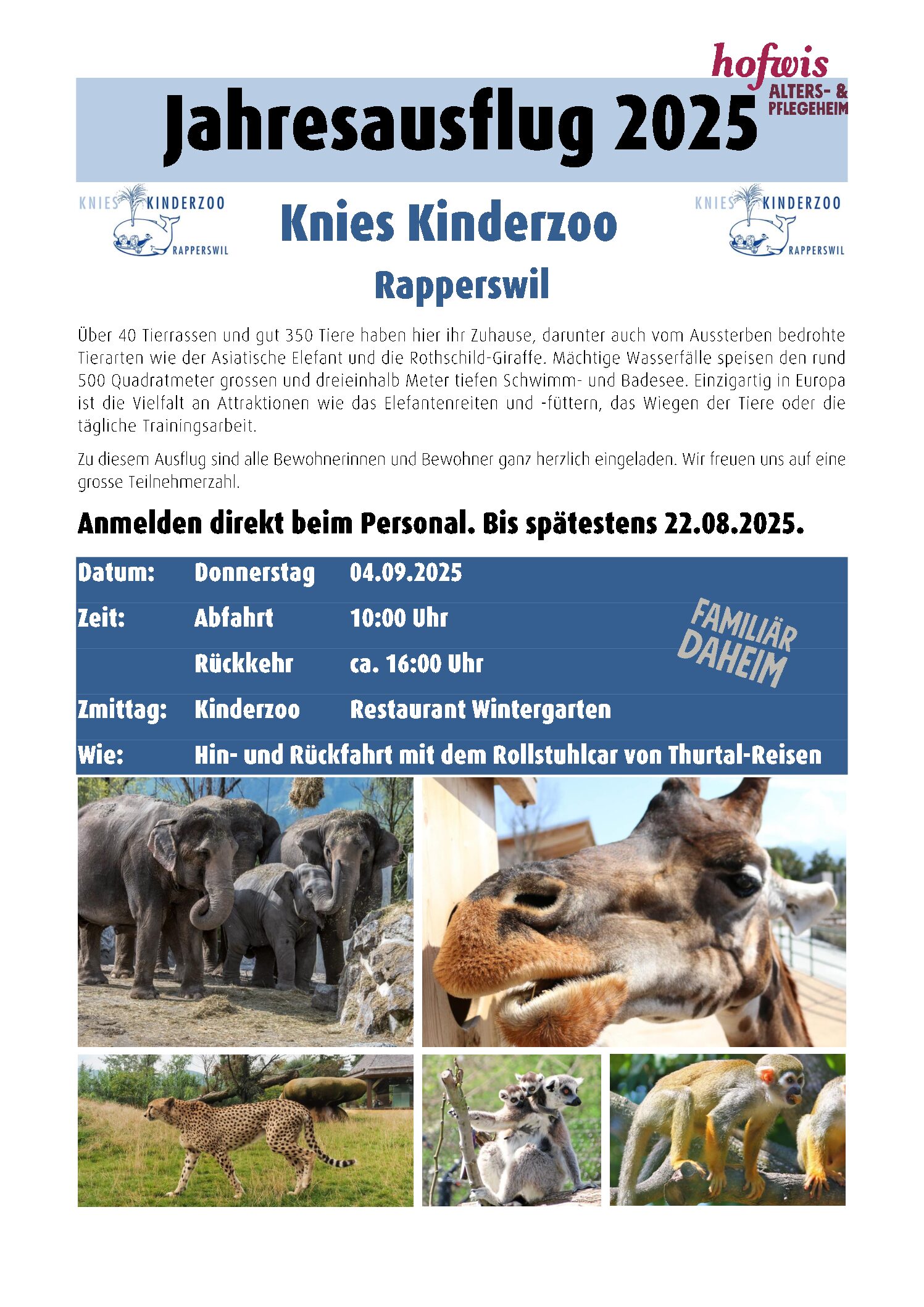 Der diesjährige Jahresausflug führt uns in den Kinderzoo in Rapperswil. Auf vielseitigen Wunsch der Bewohnerinnen und Bewohner werden wir den Tag inkl. Mittagessen im Knies Kinderzoo verbringen. Wir freuen uns auf einen interessanten Besuch und auf hoffentlich freundliches Wetter.